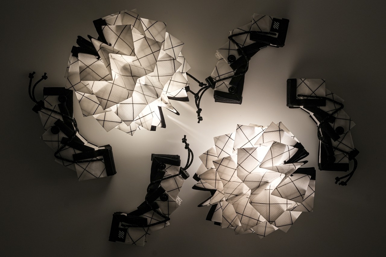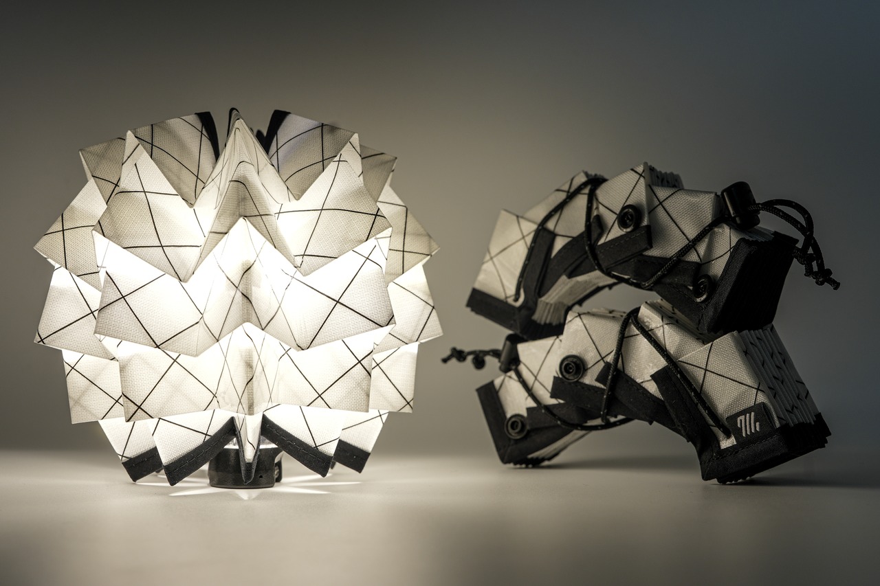 特殊な折り紙の技術で折られたシェードは上部のドローコードで調整することで形状が変化し、様々なLEDランタンにフィットします