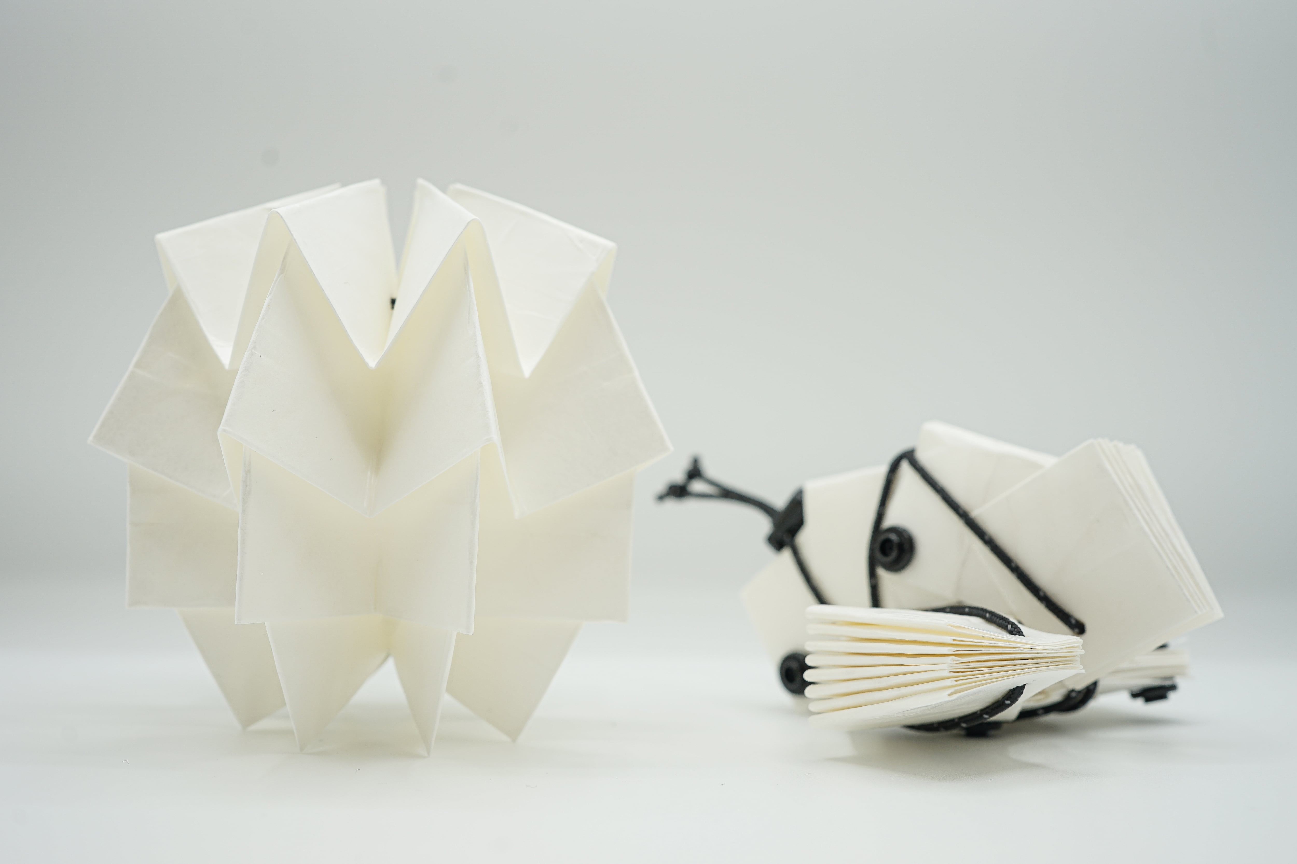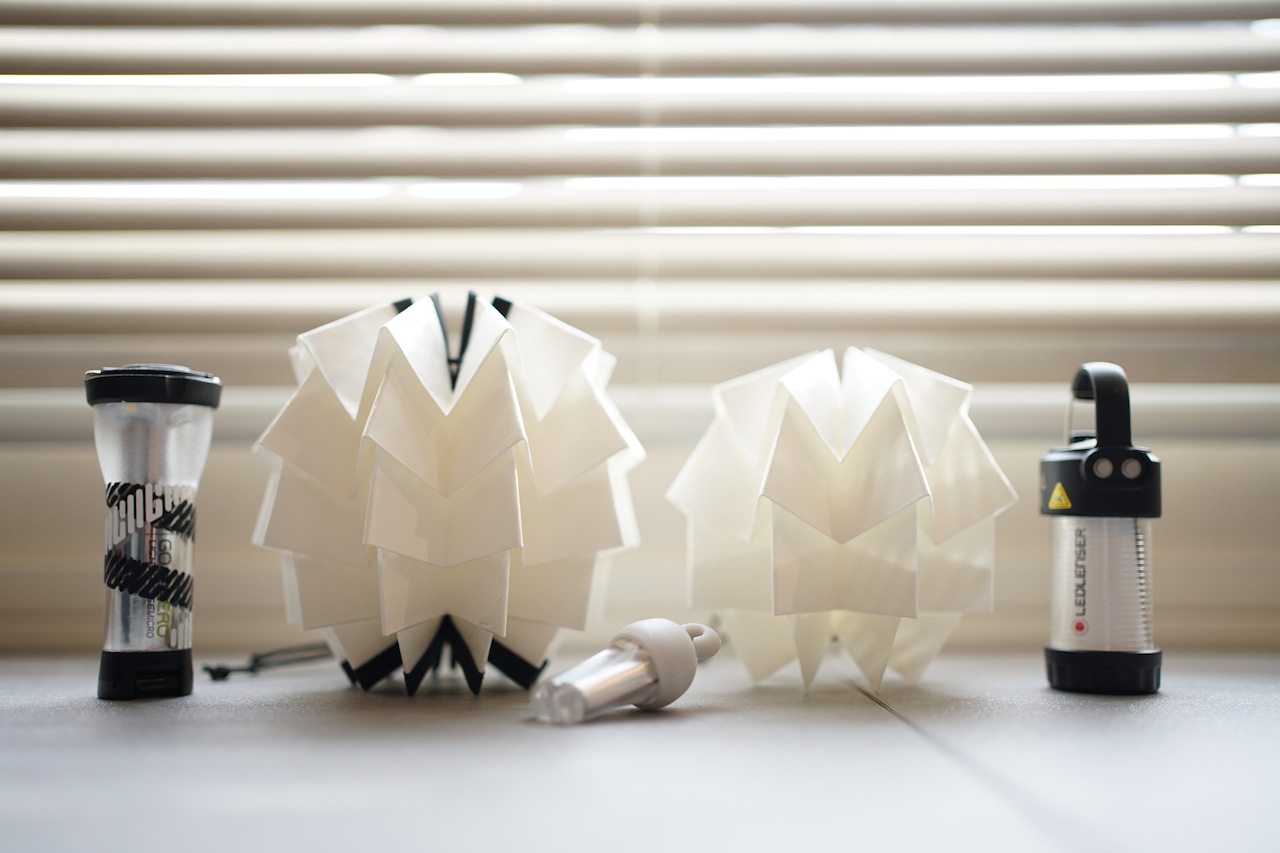 特殊な折り紙の技術で折られたシェードは上部のドローコードで調整することで形状が変化し、様々なLEDランタンにフィットします。